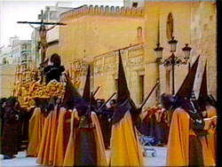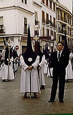 encapuchados y ataviados en el color característico de su hermandad, junto